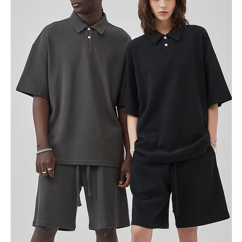 Premium nefes Waffle şort takımı-büyük boy rahat üst ve geniş bacak şort Polo T shirt